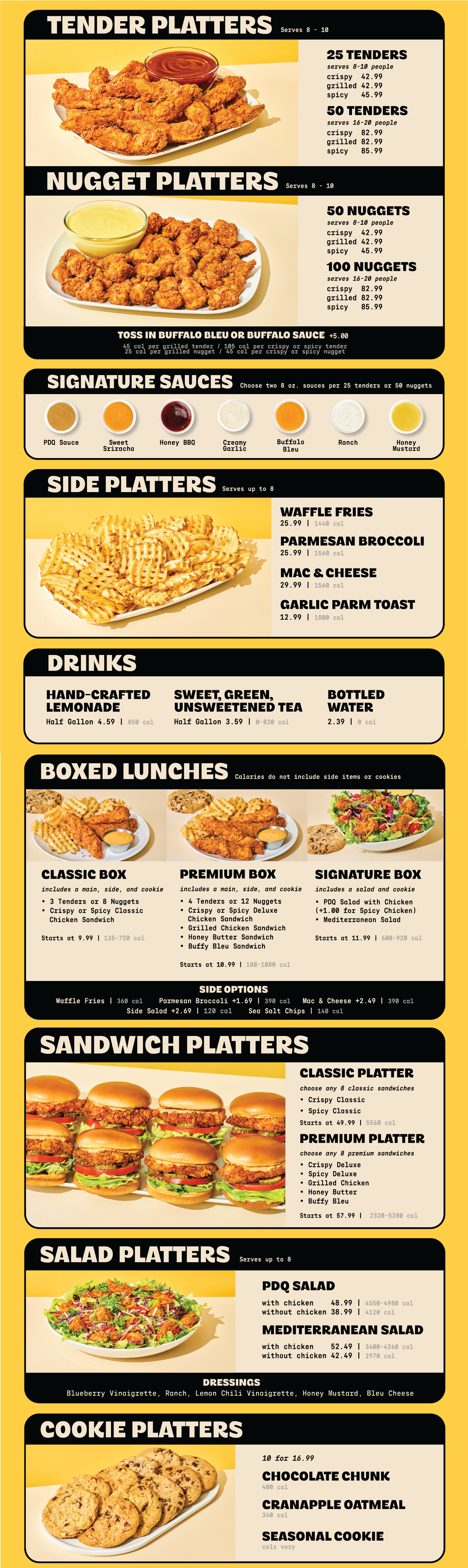 Menu featuring tender platters, nugget platters, signature sauces, side platters, drinks, boxed lunches, sandwich platters, salad platters, and cookie platters. Includes options like crispy or grilled tenders, waffle fries, lemonade, and various salad and sandwich choices. Prices and calorie information are provided.